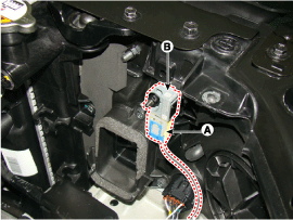 Отсоедините разъем датчика лобового столкновения (А) и ослабьте гайки, чтобы снять датчик лобового столкновения (В).
