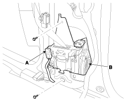 Отсоединив разъем (А), ослабьте болты крепления и снимите натяжитель переднего ремня (В).