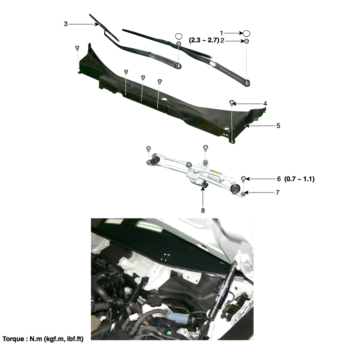 Hyundai Genesis: Компоненты и расположение компонентов двигателя стеклоочистителя/омывателя/переднего стеклоочистителя