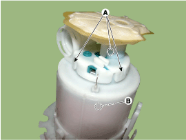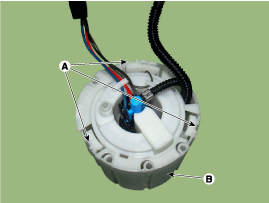 Снимите двигатель топливного насоса (В), освободив фиксирующие крюки (А).