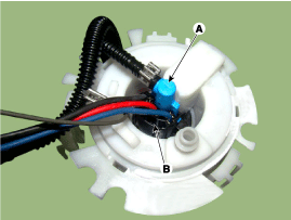 Отсоедините разъем электродвигателя топливного насоса (В).