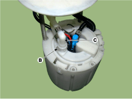 Отсоедините шланг подачи топлива (С), предварительно сняв фиксирующий зажим (В).