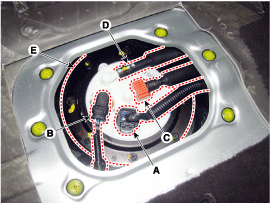 Снимите крышку пластины топливного насоса (Е) после ослабления установочных болтов, а затем снимите топливный насос.