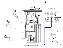 С помощью омметра измерьте сопротивление между контактами 5 и 6 разъема датчика (А) на каждом уровне поплавка.