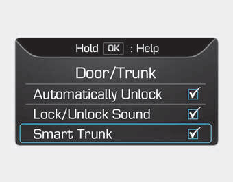 Чтобы активировать Smart Trunk, перейдите к Режим пользовательских настроек и выберите Smart Trunk на ЖК-дисплее.