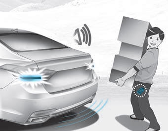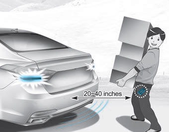 Если вы находитесь в зоне обнаружения площадь (20~40 дюймов (50~100 см) позади транспортного средства) несущий смарт ключа, аварийная световая сигнализация будет мигать и звуковой сигнал будет звучать около 3 секунд чтобы предупредить вас, что смарт-ключ имеет обнаружен, и багажник откроется.