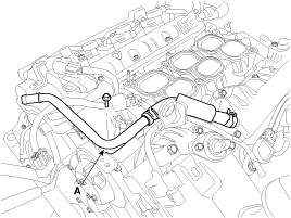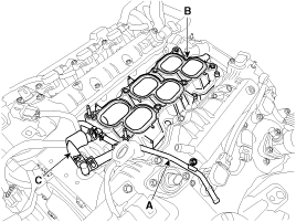 Снимите водяной шланг (C) и трубу (A), затем снимите впускной коллектор (B).