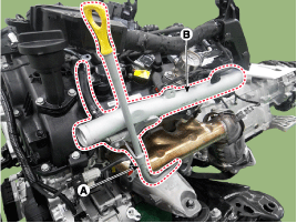 Снимите выпускную трубу и шланг для воды (B), а затем стержень указателя уровня масла (A).