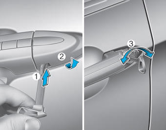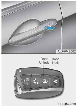 Чтобы запереть двери, нажмите кнопку на за наружную ручку двери при переноске смарт-ключ с собой или нажмите кнопка блокировки двери на смарт-ключе.