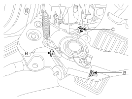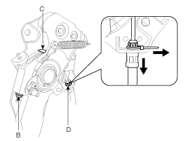 Снимите регулировочную гайку троса (В) и направляющую троса (С). А потом