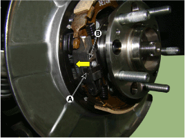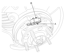 Нажимая на пружину, установите прижимной штифт тормозной колодки (А) и пружину (В).