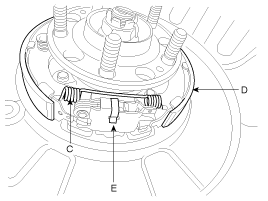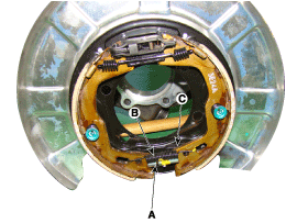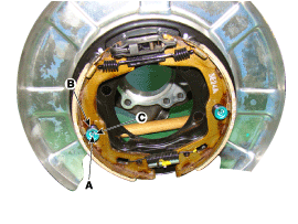 Снимите верхнюю возвратную пружину (С) и тормозные колодки (D).
