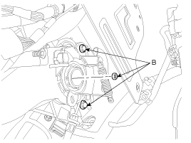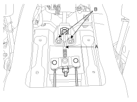 Снимите крепежные болты и гайку (В) педали стояночного тормоза, затем снимите педаль стояночного тормоза.