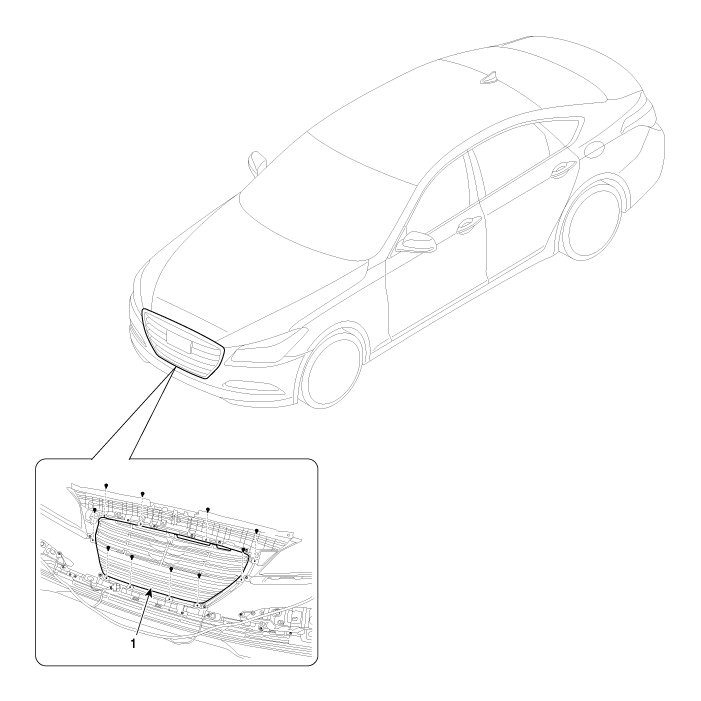 Hyundai Genesis (DH) 2013-2016 Руководство по ремонту / Кузов (внутри и снаружи) / Передний бампер / Компоненты решетки радиатора и расположение компонентов