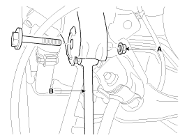 Отсоедините задний вспомогательный рычаг (В) от заднего подрамника, ослабив болт и гайку (А).
