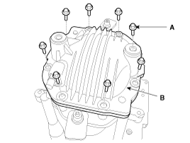 Ослабьте болты уплотнения, а затем снимите водило шестерни (А) и зубчатый венец (В).