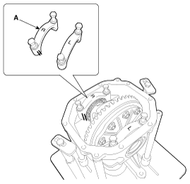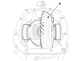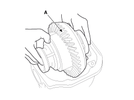 Удерживайте наружные кольца левого и правого боковых подшипников обеими руками. руками и установите корпус шестерни в сборе (А) на дифференциал. случай.