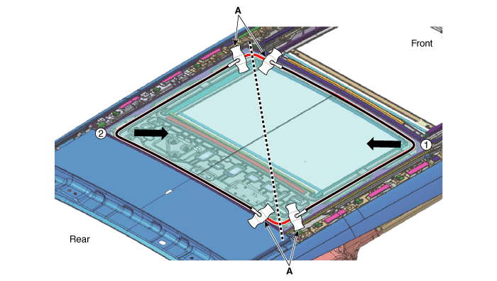 Совместите заднее стекло (A) и панель кузова, прежде чем полностью установить переднее стекло.