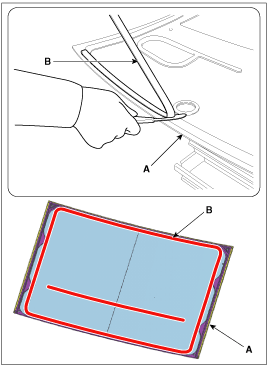 Если заднее стекло (A) используется повторно, используйте лезвие, чтобы удалить остатки герметика (B) вокруг панели кузова.