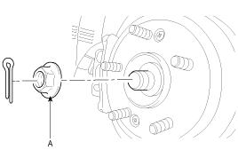 Снимите шплинт, затем снимите корончатую гайку (А) и шайбу с передней ступицы.