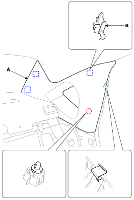 Снимите облицовку задней стойки (А), нажав на край зажима (В) с помощью подходящего инструмента.