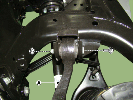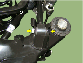 Ослабьте фланцевый болт и гайки (А), а затем задний верхний передний рычаг.