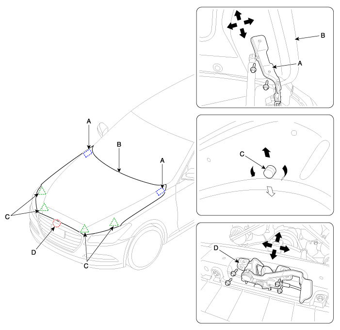 Ослабив болты крепления замка капота (D), отрегулируйте положение замка, перемещая его вверх-вниз или из стороны в сторону.