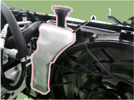 Снимите расширительный бачок (А) после ослабления болтов крепления вентилятора охлаждения. и затем отсоедините шланг перелива (B).