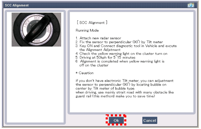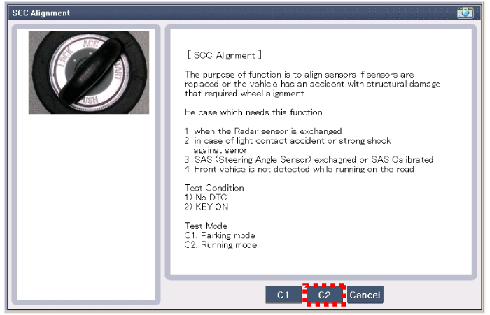 Чтобы выполнить горизонтальное выравнивание датчика, подключите GDS после запуска двигателя и выберите «SCC Alignment».