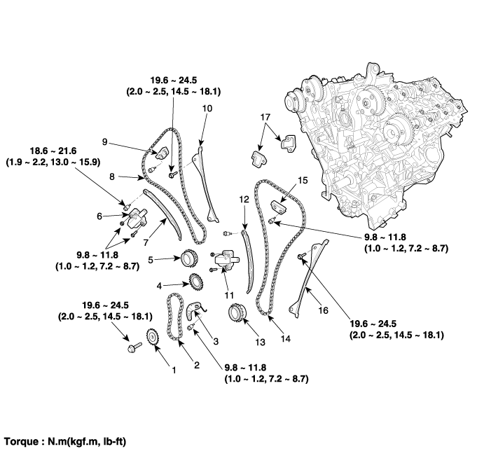 14. Левая цепь ГРМ 15. Левый кулачок к направляющей кулачка 16. Левая направляющая цепи ГРМ 17. адаптер натяжителя |