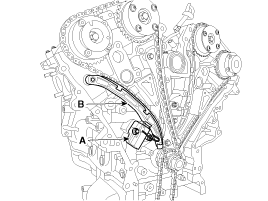Снимите автоматический натяжитель левой цепи привода ГРМ (А) и рычаг натяжителя левой цепи привода ГРМ (В).