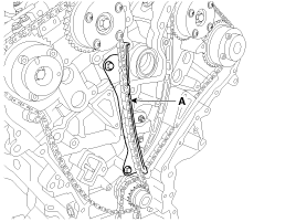 Опустите звено натяжителя (А), сожмите поршень правого натяжителя цепи ГРМ и зафиксируйте натяжитель стопорным штифтом.