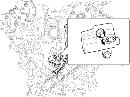 Установите установочный штифт после сжатия натяжителя левой цепи ГРМ.