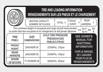 Табличка, расположенная на водительском накладка на порог дает оригинальный размер шин, рекомендуется давление в холодных шинах для вашего автомобиля, количество людей которые могут быть в вашем автомобиле и грузоподъемность автомобиля вес.