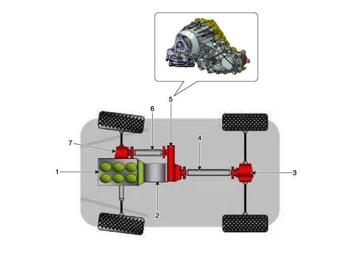 2. Трансмиссия 3. Задний дифференциал 4. Задний карданный вал |