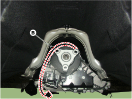 Снимите проводку (B), закрепленную на раздаточной коробке, после разборки разъема ЭБУ раздаточной коробки (AWD) (A).