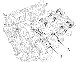 Снимите крышку левого/правого подшипника распределительного вала (А) и крышку упорного подшипника (В).