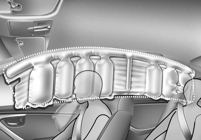 Шторки безопасности расположены вдоль обоих боковых рейлингов на крыше. над передней и задней дверью.
