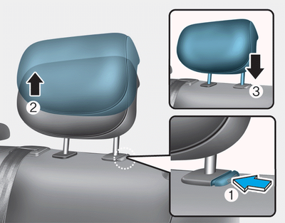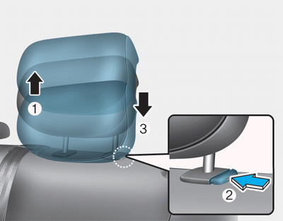 Чтобы установить подголовник, потяните его вверх (1). Понижать подголовник, нажмите и удерживайте кнопку (2), расположенную в основании подголовника. подголовник, затем опустите подголовник (3).