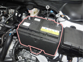 Отсоедините положительную (+) клемму аккумуляторной батареи (В).