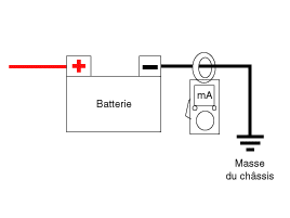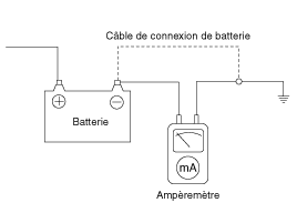 Подключите амперметр последовательно между (-) клеммой аккумуляторной батареи.