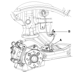 Снимите гайку (А) и болт (В), крепящие кабель датчика.