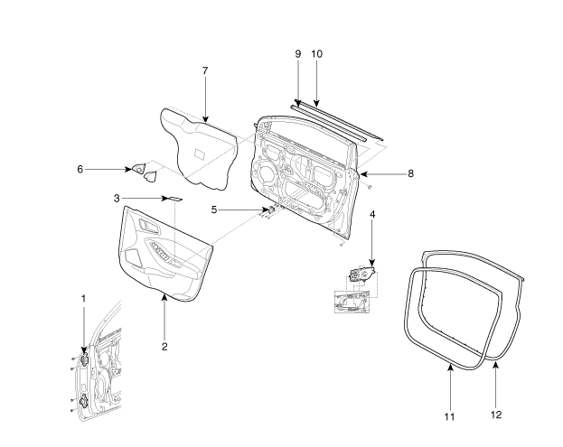 8. Панель передней двери 9. Внутренняя уплотнительная лента ниши передней двери 10. Внешний уплотнитель ниши передней двери 11. Резинка бокового уплотнителя кузова передней двери 12. Резинка бокового уплотнителя передней двери |