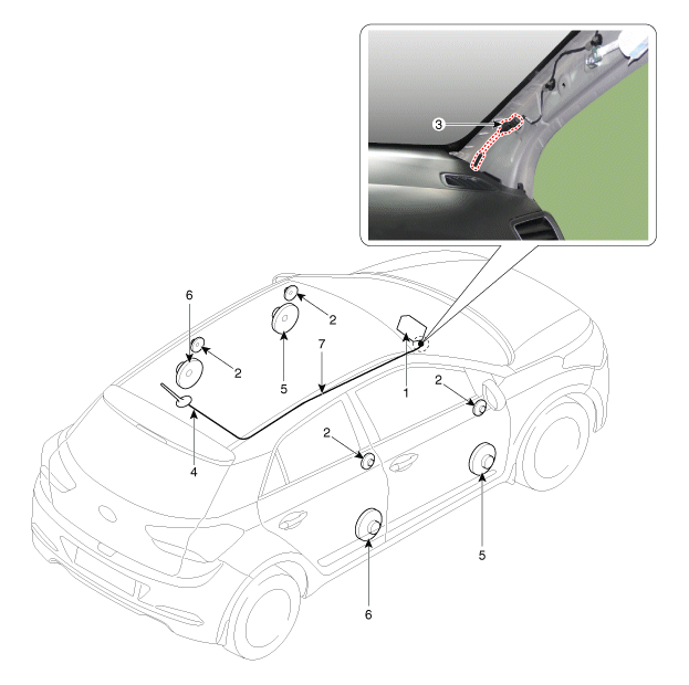 6. Динамик в задней двери 7. Кабель питания антенны |