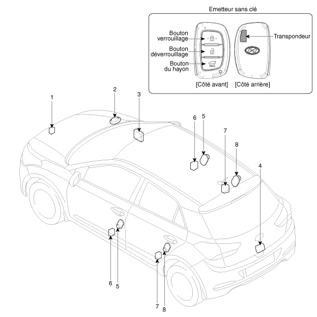 2. Противоугонная сигнализация 3. РЧ-антенна и BCM 4. Переключатель открывания крышки багажника. 5. Переключатель передней двери |