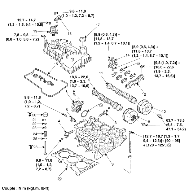 2. Головка блока цилиндров 3. Впускной масляный регулирующий клапан (OCV) 4. Клапан управления выхлопным маслом (OCV) 5. Датчик положения распределительного вала (CMPS) 6. Вакуумный насос 7. Уплотнительное кольцо вакуумного насоса 8. Выхлоп CVVT 9. Распредвал выпускных клапанов |