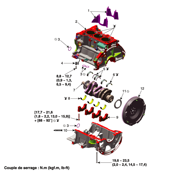 8. Нижний коренной подшипник коленчатого вала 9. Крышка коренного подшипника коленчатого вала. 10. Лестничное шасси 11. Задний сальник 12. Маховик |