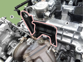 Снимите теплозащитный экран (А) и подвеску двигателя (В).