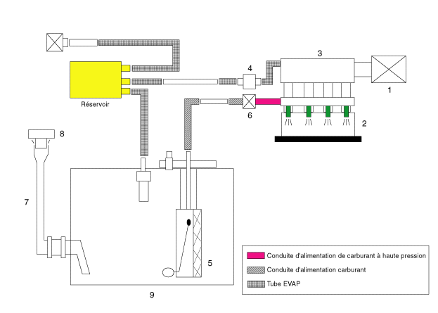 2. Топливопровод и форсунка 3. Двигатель 4. Электромагнитный клапан управления продувкой (PCSV) 5. Топливный насос высокого давления |