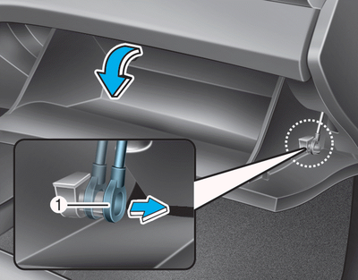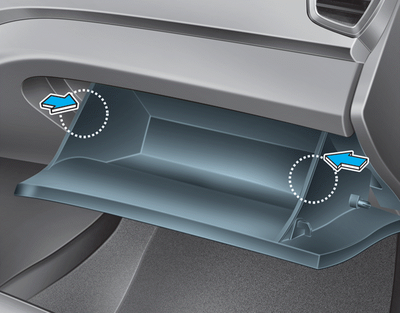 3. Нажмите на обе стороны перчаточного ящика, как показано на рисунке. Этот гарантирует, что стопорные штифты перчаточного ящика будут выпущены из места их удержания, позволяя перчаточному ящику быть в подвеске..